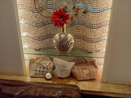 なんて素敵なのでしょう(*´д`*)高級感のある空間に出勤バックといただきものを並べてみました✨シマエナガちゃんが浮いてます(笑)